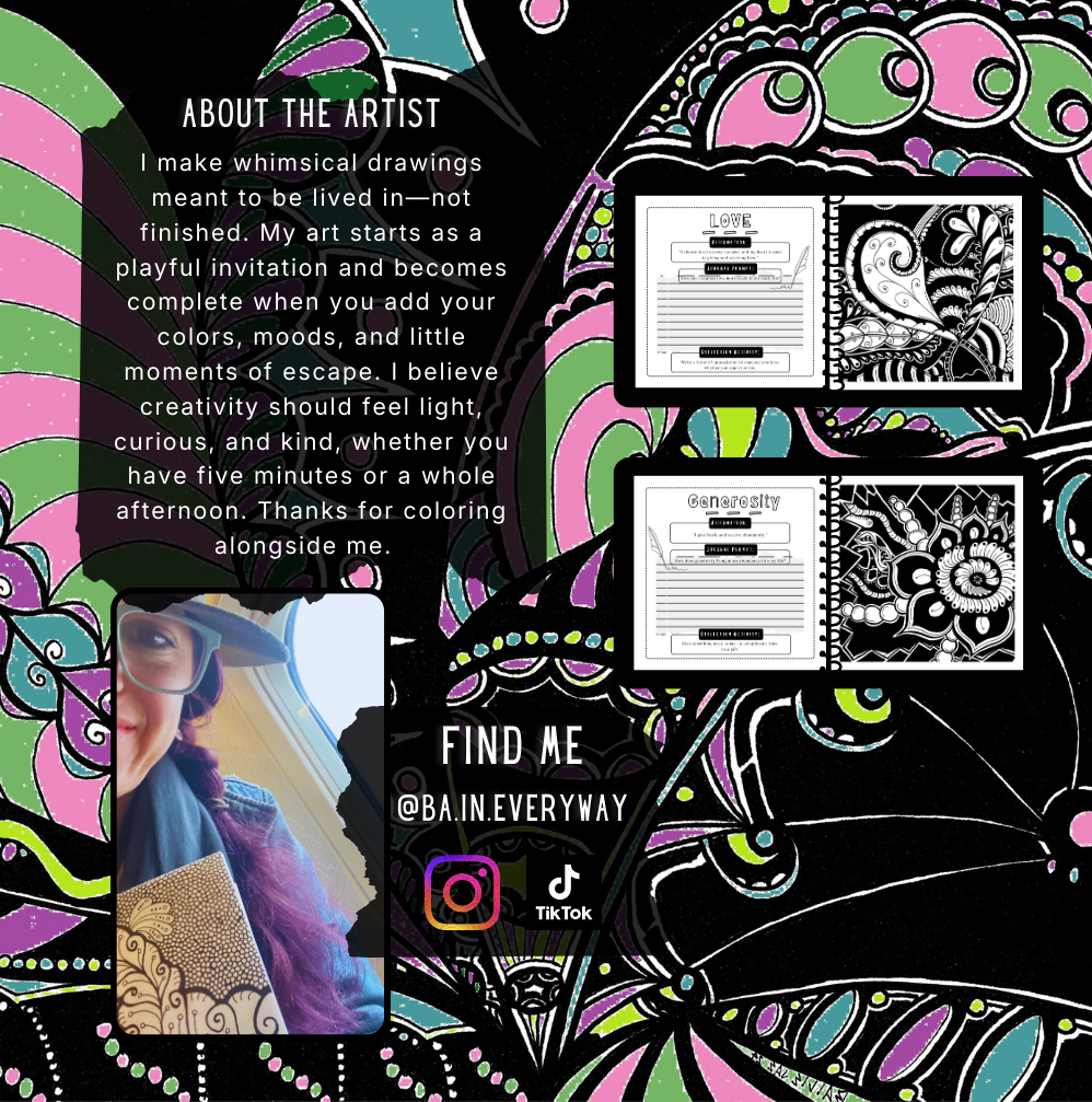 Each principle is accompanied with an affirmation, journal prompt, and reflection activity, alongside a hand drawn, Zentangle-inspired, coloring page designed to quiet the mind and awaken the soul. As you color, write, and reflect, you’ll deepen your connection to yourself and the world around you. Wellness is a We Game—let’s journey together.